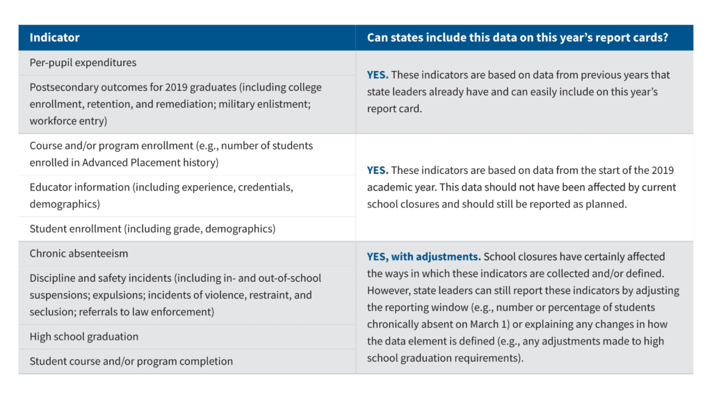 As DQC discussed in our brief, Promoting Transparency and Maintaining Public Trust: Report Cards and the COVID-19 Crisis, there is plenty of data that states can update on their report cards as usual. Data like per-pupil expenditure data and postsecondary outcomes data are based on information from previous years and can be reported with no changes, though states must include language that provides context for this information. Similarly, data like course enrollment, student enrollment and educator information are all based on information from the beginning of the 2019-2020 school year and can be reported as planned.