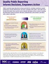 Quality Public Reporting Informs Decisions, Empowers Action is part of the Data Quality Campaign’s series on public reporting of education data. To see the full suite of public reporting materials, including the full primer; the federal spotlight; and resources for parents, administrators, and local school board members, go to dataqualitycampaign.org/publicreporting.