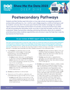Students and their families need information on how high schools prepare students for postsecondary pathways and students’ outcomes after high school. But in the seven years DQC has been reviewing state report cards, we have found that many states are still not providing this information. This deep dive examines how states provided postsecondary pathways data on their 2022 report cards and points out opportunities for states to better provide information to students and families.