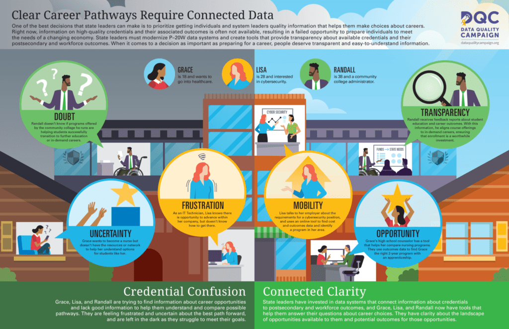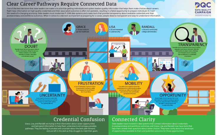 One of the best decisions that state leaders can make is to prioritize getting individuals and system leaders quality information that helps them make choices about careers. Right now, information on high-quality credentials and their associated outcomes is often not available, resulting in a failed opportunity to prepare individuals to meet the needs of a changing economy. When it comes to a decision as important as preparing for a career, people deserve transparent and easy-to-understand information. This infographic illustrates what happens when state leaders modernize their P–20W data systems and create tools that provide transparency about available credentials and their postsecondary and workforce outcomes.
