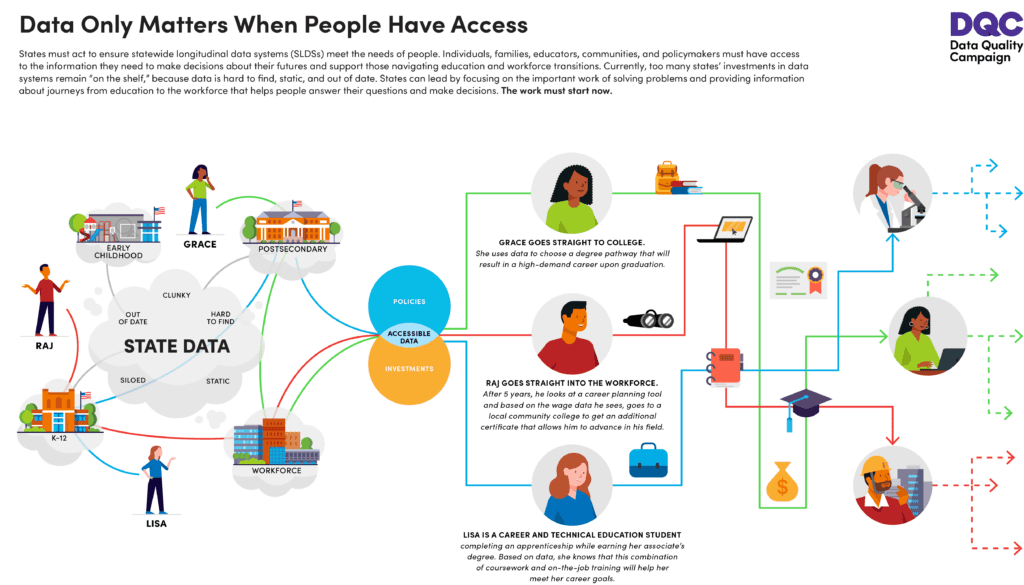 States must act to ensure statewide longitudinal data systems (SLDSs) meet the needs of people. Individuals, families, educators, communities, and policymakers must have access to the information they need to make decisions about their futures and support those navigating education and workforce transitions. Currently, too many states’ investments in data systems remain “on the shelf,” because data is hard to find, static, and out of date. States can lead by focusing on the important work of solving problems and providing information about journeys from education to the workforce that helps people answer their questions and make decisions. The work must start now.
