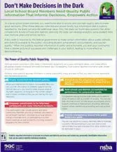 Don’t Make Decisions in the Dark: Local School Board Members Need Quality Public Information That Informs Decisions, Empowers Action is part of the Data Quality Campaign’s series on public reporting of education data. To see the full suite of public reporting materials, including the full primer; the federal spotlight; and resources for parents, administrators, and local school board members, go to wpdqc.snapshotdev.com/PublicReporting.