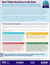 Don’t Make Decisions in the Dark: Superintendents and Principals Need Quality Public Reporting That Informs Decisions, Empowers Action is part of the Data Quality Campaign’s series on public reporting of education data. To see the full suite of public reporting materials, including the full primer; the federal spotlight; and resources for parents, administrators, and local school board members, go to wpdqc.snapshotdev.com/PublicReporting.