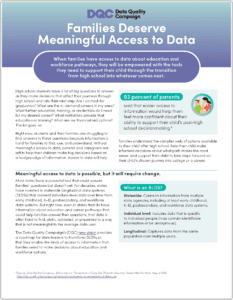 High school students have a lot of big questions to answer as they make decisions that affect their journeys through high school and into their next step. Right now, students and their families are struggling to find answers to these questions because information is hard for families to find, use, and understand. This resource highlights how access to data empowers families with the tools to support their child through transitions after high school.