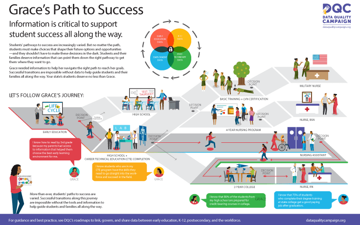 Grace’s Path to Success follows one student, Grace, and her family as they use data to make important decisions that help her reach her goals, from early education to career. Empowered with information on the many options available to her throughout her journey, Grace and her family choose the best pathway for her without making decisions in the dark.
