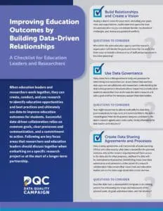 When education leaders and researchers work together, they can create, conduct, and use research to identify education opportunities and best practices and ultimately use data to improve education outcomes for students. Successful data-driven collaboration relies on common goals, clear processes and communication, and a commitment to action. This document highlights key focus areas that researchers and education leaders should discuss together when embarking on a specific research project or at the start of a longer-term partnership.