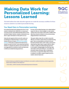 No vision of personalized learning can be realized without support for data use. State strategies to create student-centered classrooms require critical policy conditions that allow those closest to students to access and use timely, safeguarded data to make decisions. This case study outlines steps SEAs can take to ensure the effective use of data to achieve their personalized learning goals. These recommendations are based on lessons learned from Rhode Island, South Carolina, and Vermont—states that have taken steps to support districts’ efforts to deliver a quality personalized learning experience for all students. Drawing insights from interviews with state leaders and local practitioners, case studies, and document reviews, this paper offers considerations for how SEAs can support the ability of those closest to students to use data to support student success in student-centered classrooms.
