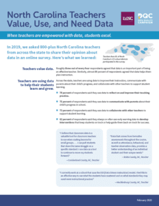 The Data Quality Campaign partnered with EducationNC to learn more about the opinions of teachers in North Carolina. In 2019, EducationNC asked more than 800 North Carolina teachers from across the state to share their opinion about data in an online survey. We learned that teachers value, use, and need data to better support their students’ learning and outcomes. Teachers also expressed the actions states can take to ensure the time, training, and tools needed to make data use in the classroom possible.