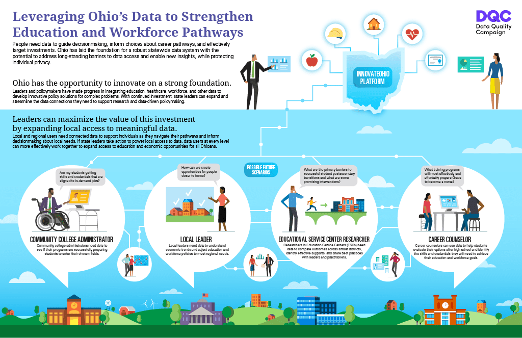People need data to guide decisionmaking, inform choices about career pathways, and effective target investments. Ohio has laid the foundation for a robust statewide data system with the potential to address long-standing barriers to data access and enable new insights, while protecting individual privacy. This infographic illustrates how Ohio’s linked data system allows data users at every level to work more effectively together in expanding access to education and economic opportunities for all Ohioans.