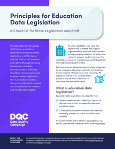 The Data Quality Campaign has tracked and reported on education data legislation in all 50 states and the District of Columbia since 2014. State legislators have the opportunity to create and support legislation that positions data as a tool to help decisionmakers at all levels take action to support student success. Through tracking these important data-focused actions, DQC has identified common elements of data-related legislation that successfully enables those who need data to make decisions that serve students and further policy goals. This checklist can serve as a guide to crafting legislation that addresses education data.