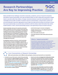 States and districts face challenges around the construction, production, and use of research in education. And the most helpful research for educators to put into practice examines the landscape of education and identifies strategies that are proven to help students succeed. Research partnerships – diverse partnerships that bring education researchers and practitioners together to create and use evidence to inform practice – provide leaders the evidence-based information they need to benefit students. DQC’s fact sheet details how research partnerships can benefit states and districts, and lays out the core characteristics and drivers of research partnerships.