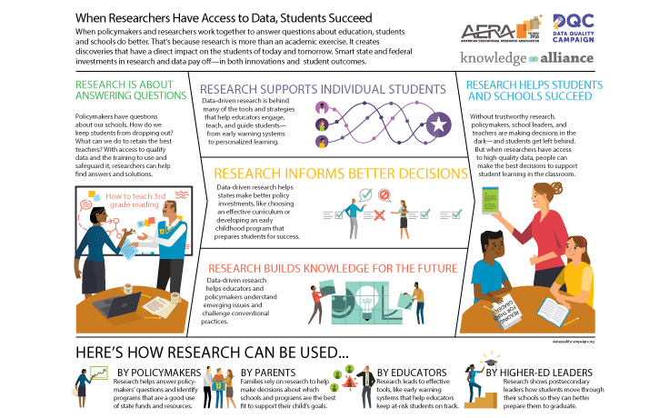 When policymakers and researchers work together, students and schools do better. That’s because research is more than an academic exercise. It creates discoveries that have a direct impact on the students of today and tomorrow. Smart state and federal investments in research and data pay off—in both innovations and student outcomes. With access to quality data and the training to use and safeguard it, researchers can help find answers and solutions to questions about education. In partnership with the American Educational Research Association (AERA) and Knowledge Alliance, the Data Quality Campaign has released an infographic that shows how researchers’ access to data can help students succeed.