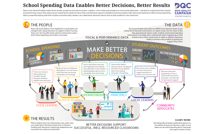 Under ESSA, states are required to publish school-level spending data in report cards. This information shines a light on the education investments in communities and how they are used to serve students. DQC’s infographic illustrates what it looks like when leaders – from state and local leaders to principals and community advocates – use school-level spending data in their roles to ensure successful, well-resourced classrooms.