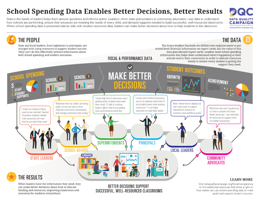 Under ESSA, states are required to publish school-level spending data in report cards. This information shines a light on the education investments in communities and how they are used to serve students. DQC’s infographic illustrates what it looks like when leaders – from state and local leaders to principals and community advocates – use school-level spending data in their roles to ensure successful, well-resourced classrooms.