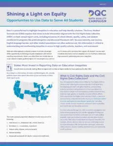 Data is a powerful tool to highlight inequities in education and help identify solutions. The Every Student Succeeds Act (ESSA) requires that states include information aligned with the Civil Rights Data Collection on their annual report cards, including measures of school climate, quality, safety, and student enrollment in programs like prekindergarten and Advanced Placement. Because minority, low-income, English language learner, and other student populations are often underserved, this information is critical to understanding and ameliorating inequities in access to high-quality schools, teachers, and coursework. This resource shows how states can use equity data to improve transparency and take action on behalf of all students.