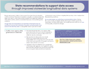These recommendations are policy and practice steps that states must take to make access to data possible from statewide longitudinal data systems, which connect data from early childhood through the workforce.