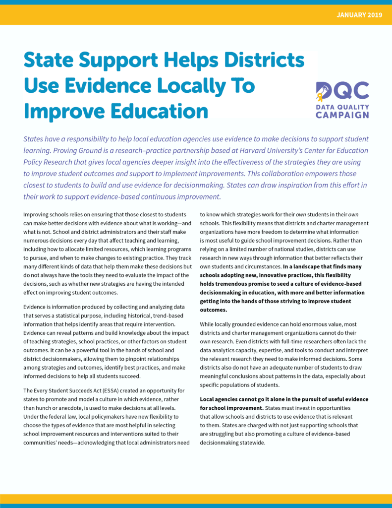 School and district leaders make many important education decisions but don’t always have the tools to evaluate their impact. ESSA encourages states to support the use of evidence by local leaders in many ways, including through research-practice partnerships. Our case study includes action steps and lessons learned state leaders can draw from to create a culture of evidence-based continuous improvement in districts and schools.