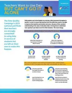 DQC’s 2019 national poll of teachers found they are strongly committed to using data in service of students – but are left on their own to make this happen. Policymakers and school leaders are missing critical moments throughout teachers’ careers and these missed opportunities are driving teachers to build their own capacity to put data to work. This brief highlights the burdens that teachers are facing in using data and the actions leaders can take to make data use in the classroom a more seamless part of the school day.
