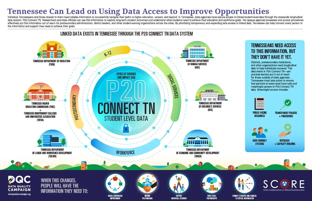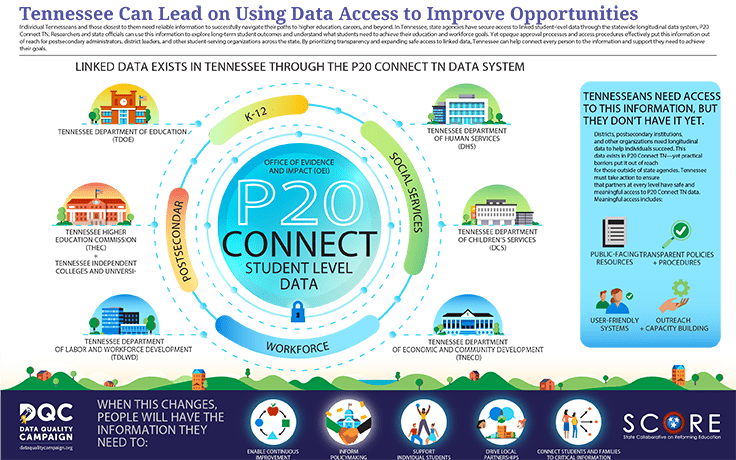 Individual Tennesseans and those closest to them need reliable information to successfully navigate their paths to higher education, careers, and beyond. In Tennessee, state agencies have secure access to linked student-level data through the statewide longitudinal data system, P20 Connect TN. Researchers and state officials can use this information to explore long-term student outcomes and understand what students need to achieve their education and workforce goals. Yet opaque approval processes and access procedures effectively put this information out of reach for postsecondary administrators, district leaders, and other student-serving organizations across the state. This infographic, developed with Tennessee’s State Collaborative on Reforming Education, illustrates that by prioritizing transparency and expanding safe access to linked data, Tennessee can help connect every person to the information and support they need to achieve their goals.