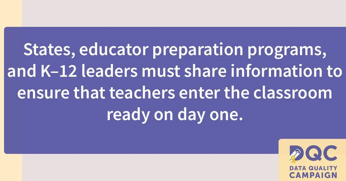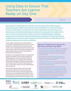 Every student, no matter where he or she lives, deserves a great teacher. States, educator preparation programs (EPPs), and K–12 leaders must work together to ensure that all teachers are learner ready on day one in the classroom. But too often, these actors do not have access to the necessary information to fully prepare teachers for the unique needs of students in their states. This situation must change, and data is essential to making that happen. This report highlights how states can lead the way by making sure that the right information is available to those who need it and that leaders have the skills to use that information for continuous improvement, not just accountability.