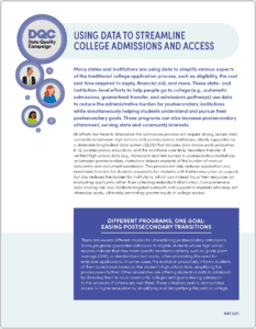 Many states and institutions are using data to simplify various aspects of the traditional college application process, such as eligibility, the cost and time required to apply, financial aid, and more. These state- and institution-level efforts use data to reduce the administrative burden for postsecondary institutions while simultaneously helping students understand and pursue their postsecondary goals. All efforts to streamline the admissions process will require strong, secure data connections between high schools and postsecondary institutions, ideally supported by a statewide longitudinal data system. This resource explores: