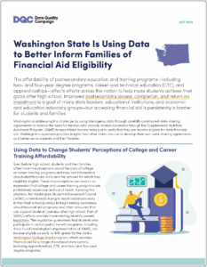 The affordability of postsecondary education and training programs affects efforts across the nation to help more students achieve their goals after high school. Improved postsecondary access, completion, and return on investment is a goal of many state leaders, educational institutions, and economic and education advocacy groups—but accessing financial aid is persistently a barrier for students and families. This resource explores how Washington state is leveraging interagency data through carefully constructed data-sharing agreements to streamline the process for students who are income eligible to access financial aid.